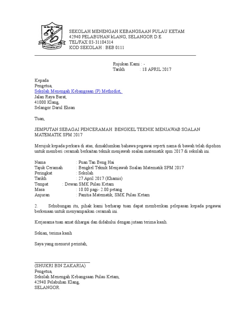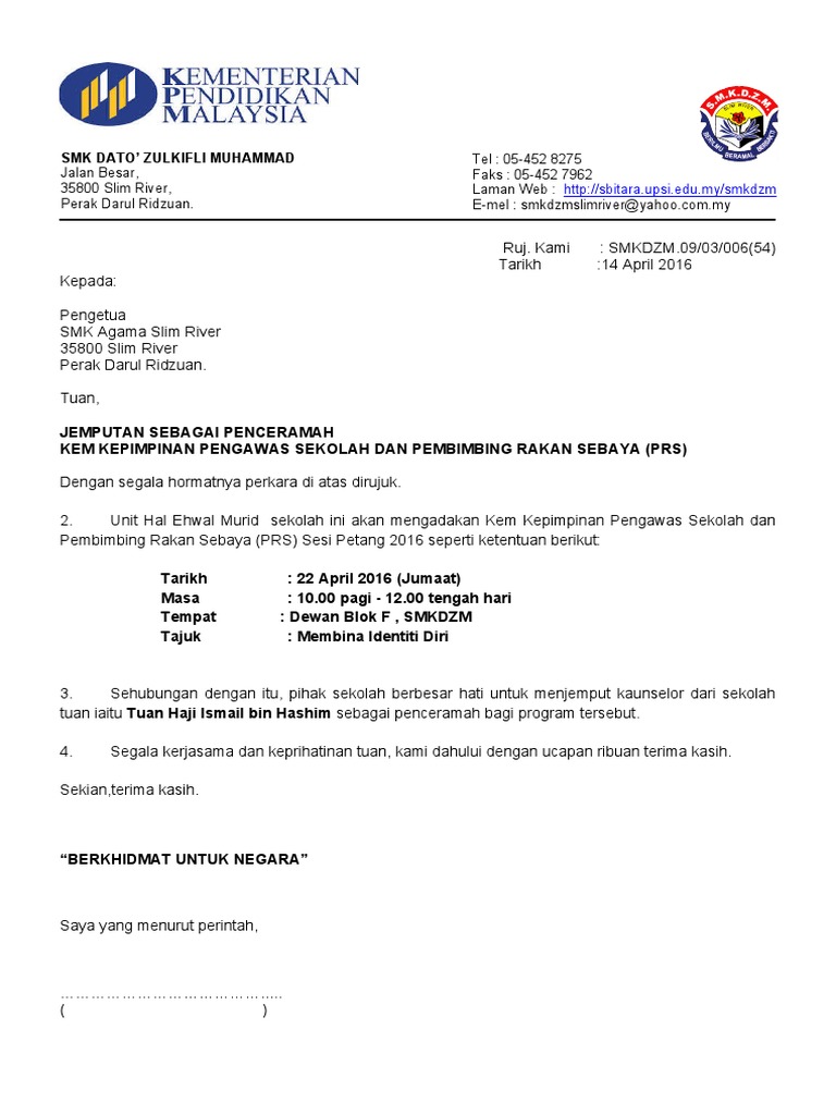 . Contoh surat jemputan penceramah untuk kem motivasi by Al_Raqibah_Bin_2217. SEKOLAH KEBANGSAAN BUKIT RAHMAT KAMPUNG BUKIT RAHMAT 84700 GERSIK TANGKAK TEL. Contoh Surat Jemputan Penceramah pestrect Hester McCormick Contoh surat kali ini adalah contoh surat permohonan untuk menjadi juri.